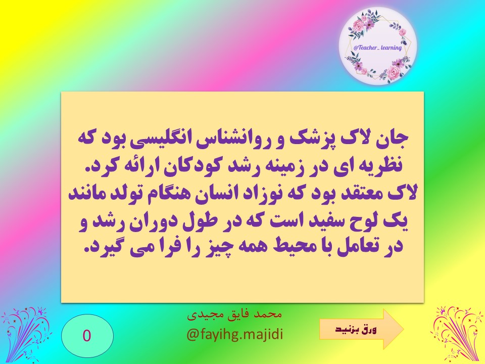 جان لاک پزشک و روانشناس انگلیسی بود که نظریه ای در زمینه رشد کودکان ارایه کرد. لاک معتقد بود که نوزاد انسان هنگام تولد مانند یک لوح سفید است که در طول دوران رشد و در تعامل با محیط همه چیز را فرا می گیرد